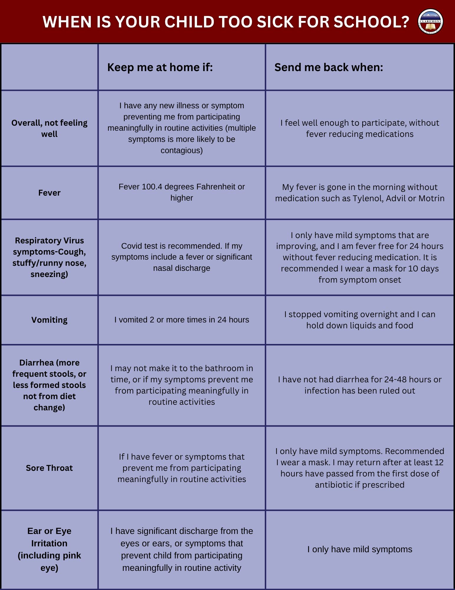 As we move through the fall months, the health of our students and staff is a top priority, especially with flu season already underway. With this in mind, we want to provide guidance for families on when it may be best to send your child to school and when to keep them home.