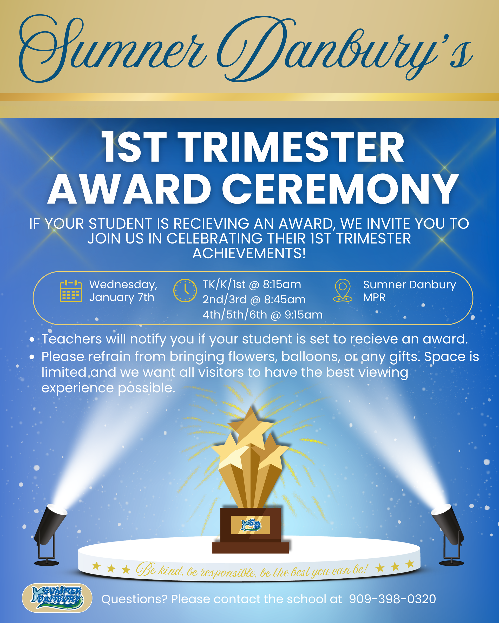 Week-at-a-Glance Monday, January 5 - First Day Back from Winter Break! Welcome Back! Tuesday, January 6 - Happy Tuesday! Wednesday, January 7 - Early Dismissal at 1:00 PM Every Wednesday for TK-6th Grade - Spirit Day - Wear your school shirt or school colors blue and green - 1st Trimester Award Ceremonies (See Flyer Below ) Thursday, January 8 - Happy Thursday! Friday, January 9 - Kids Can Recycle ♻️ - Kona Ice (See Flyer Below) - Camp Pali Donations Due (See Flyer Below) |